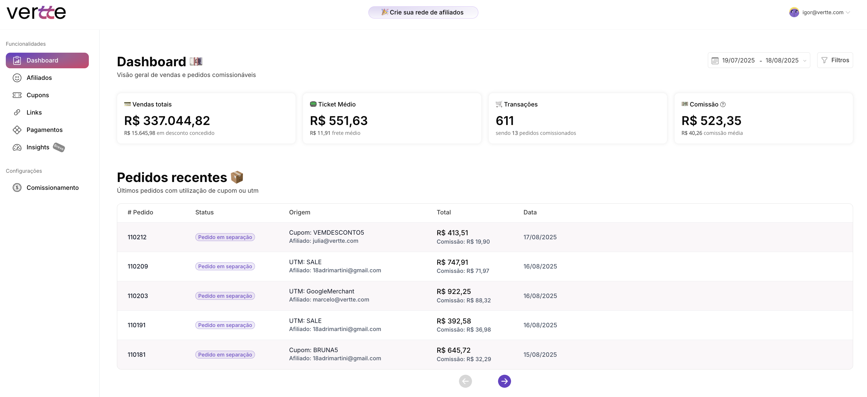 Imagine que um afiliado tem seu próprio cupom. Ele aparece em stories, blogposts e até em grupos de WhatsApp. A cada uso do cupom, vendas e valores são adicionados em tempo real no painel da Vertte.